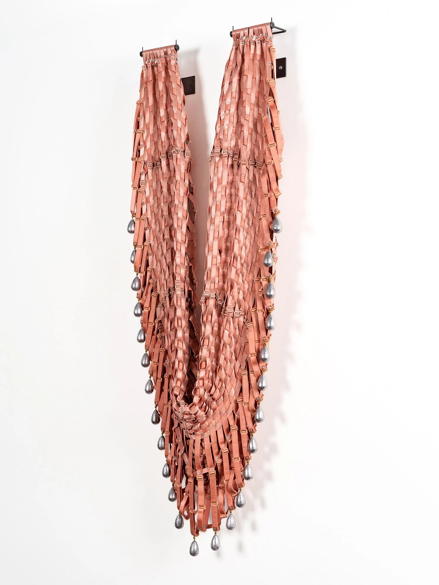 Image 1 of 3 Image 2 of 3 Image 3 of 3 LOW SLUNG, 2025 $10,000.00 Hand-dyed detachable bra straps, lead weights, aluminum rivets, steel55 x 20 x 8 inches$10,000 Add To Cart Added! Hand-dyed detachable bra straps, lead weights, aluminum rivets, steel55 x 20 x 8 inches$10,000 Image credit: Steven Miller