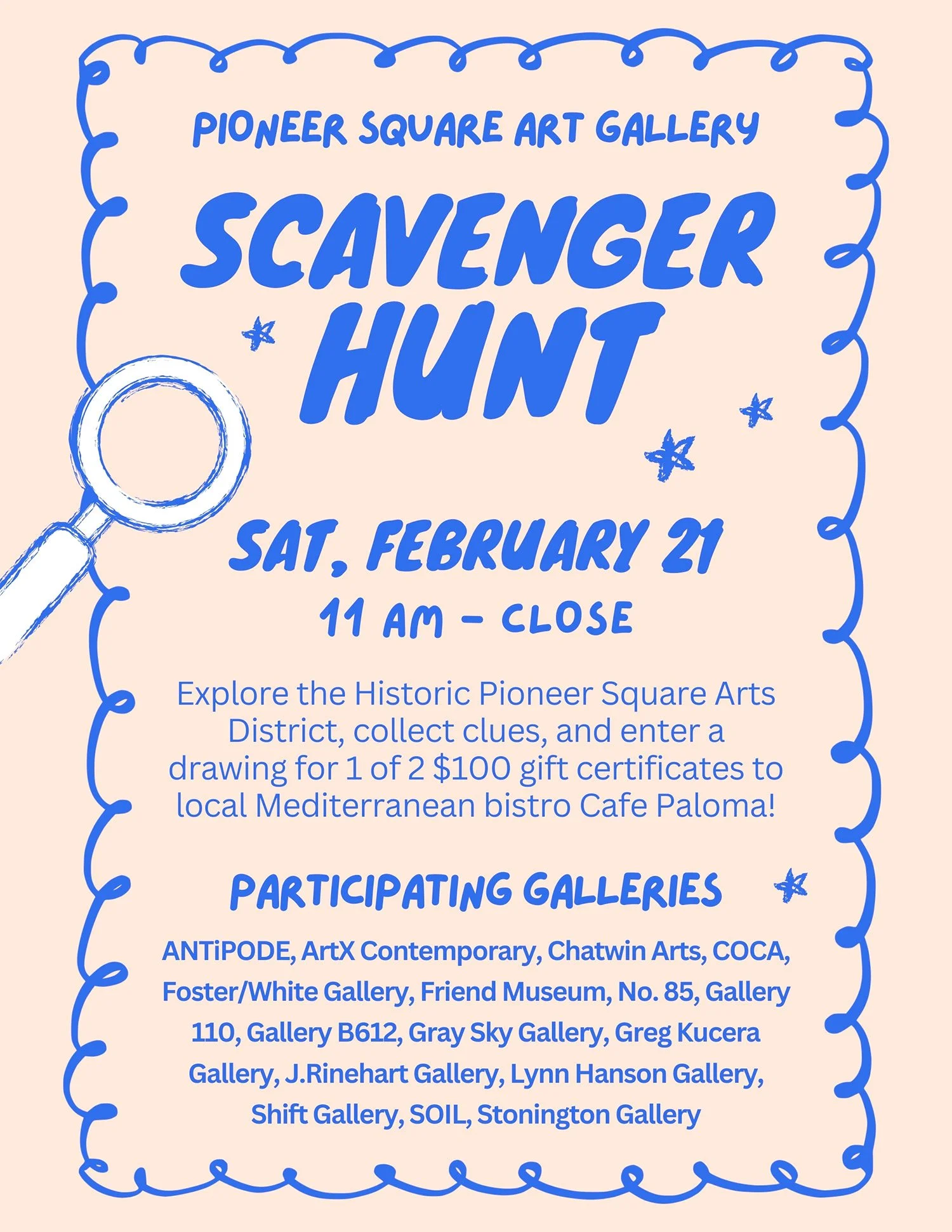 Explore the Historic Pioneer Square Arts District, collect clues, and enter a drawing to win 1 of 2 $100 gift certificates to local Mediterranean bistro, Cafe Paloma.